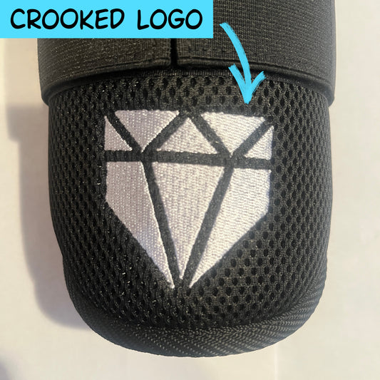 Most of these items have minor cosmetic defects like offset/crooked logos, embroidery with loose or extra threads, excessive stitching, or colors that are slightly off. A few of these items may have minor defects related to size like slight warping on the protective shell which makes the fit a little less snug than intended.